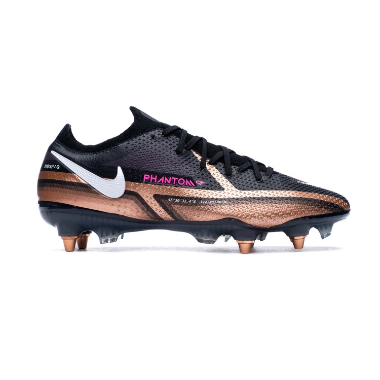 Bota de fútbol Nike Phantom GT2 Elite ACC SG-Pro ACC (Anti-Clog) para adultos. Bota de hilo con calcetín, para utilizar en campos de hierba natural húmeda o mojada. Botas de gama alta para jugadores de control y precisión en color Metallic Copper-White-Black.