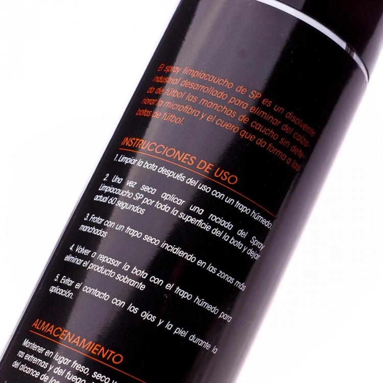 El spray limpiacaucho SP es un disolvente industrial desarrollado para eliminar del calzado de fútbol las manchas de caucho sin deteriorar la microfibra y el cuero que dan forma a las botas de fútbol.